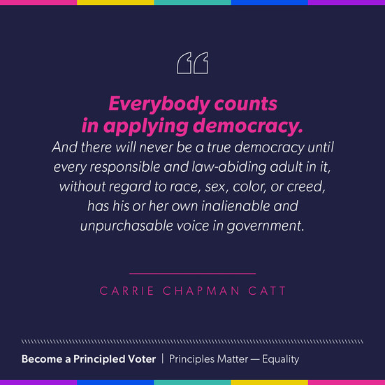 “Everybody counts in applying democracy. And there will never be a true democracy until every responsible and law-abiding adult in it, without regard to race, sex, color, or creed, has his or her own inalienable and unpurchasable voice in government.” — Carrie Chapman Catt